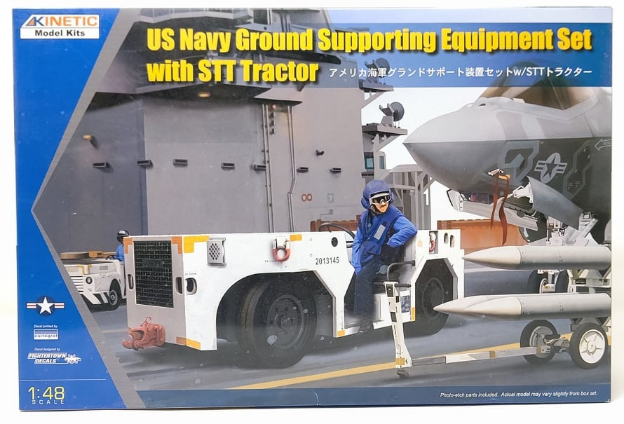 Trata-se de um kit em plástico para construção dos veículos e acessórios em uso num porta-aviões, como por exemplo um trator rebocador STT com respectivo reboque porta munições com figuras de marinheiros, para um operador e um auxiliar/municiador. Os decalques e marcações são para uma unidade em uso nas placas dos porta-aviões norte-americanos. Estão ainda incluídas algumas partes em metal fotogravado para pequenos detalhes.